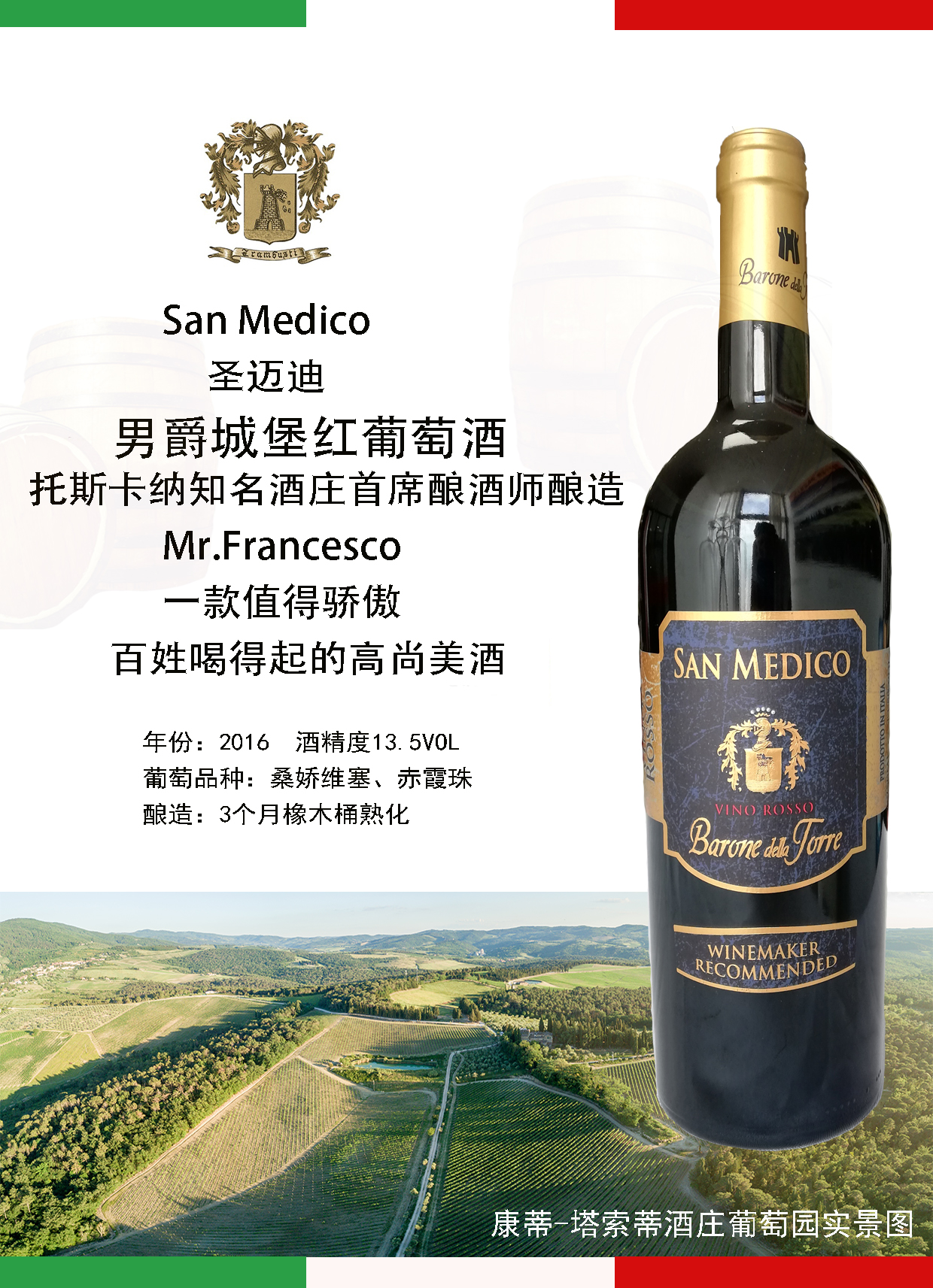 酒品介绍:男爵圣麦迪红葡萄酒 桑娇维赛 赤霞珠 托斯卡纳产区 13.5度